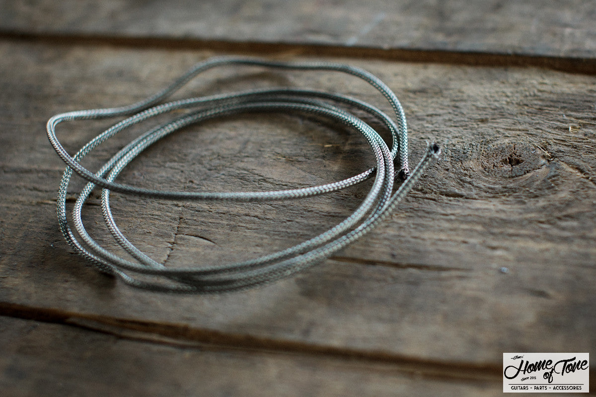 Gavitt USA, quality 22AWG 'Gibson' style silver braided wire. These are sold as 2ft lengths, so please bare that in mind when ordering. The 22 AWG single conductor shielded wire has a tinned copper stranded conductor, braided with white celanese and black cotton, waxed and tinned braided copper shield. The cloth insulation simply pushes back to expose the centre conductor wire.