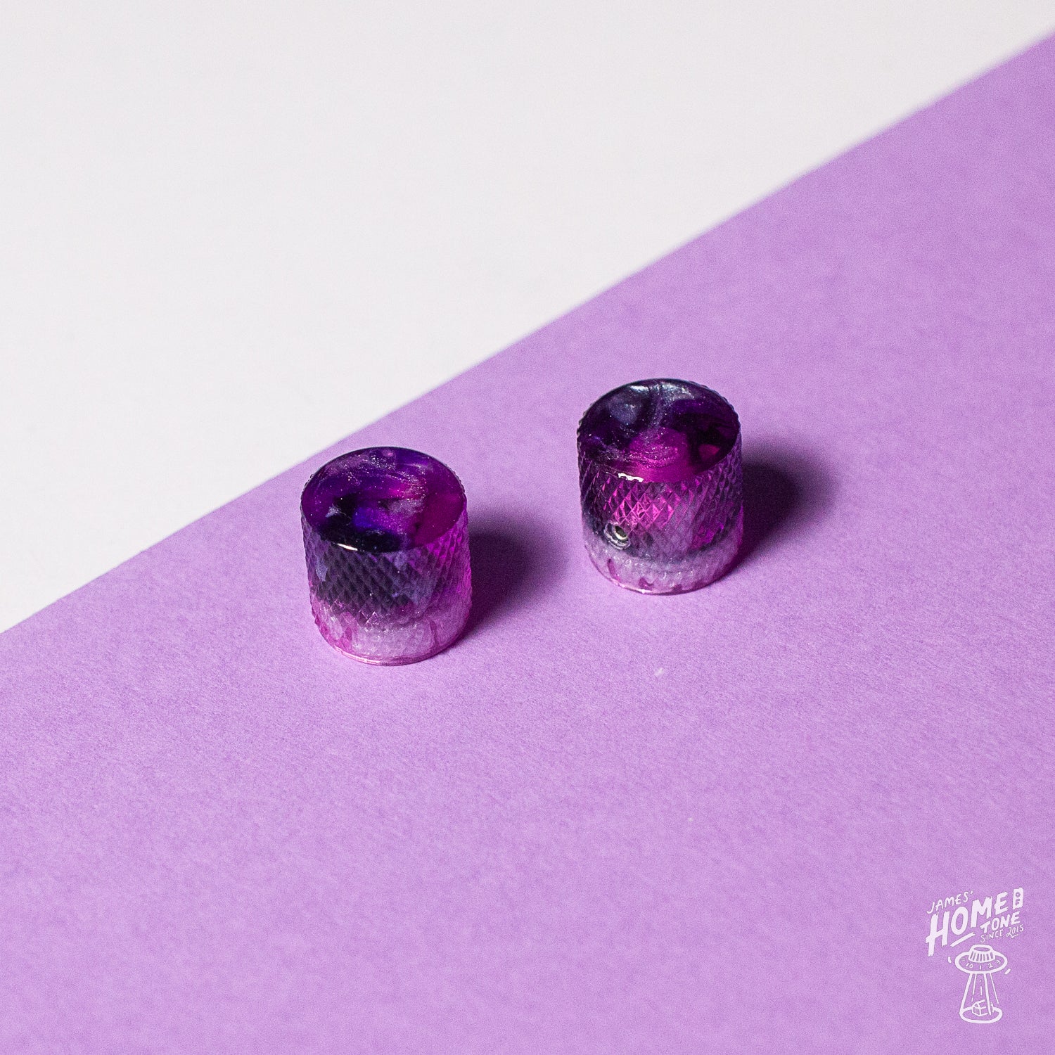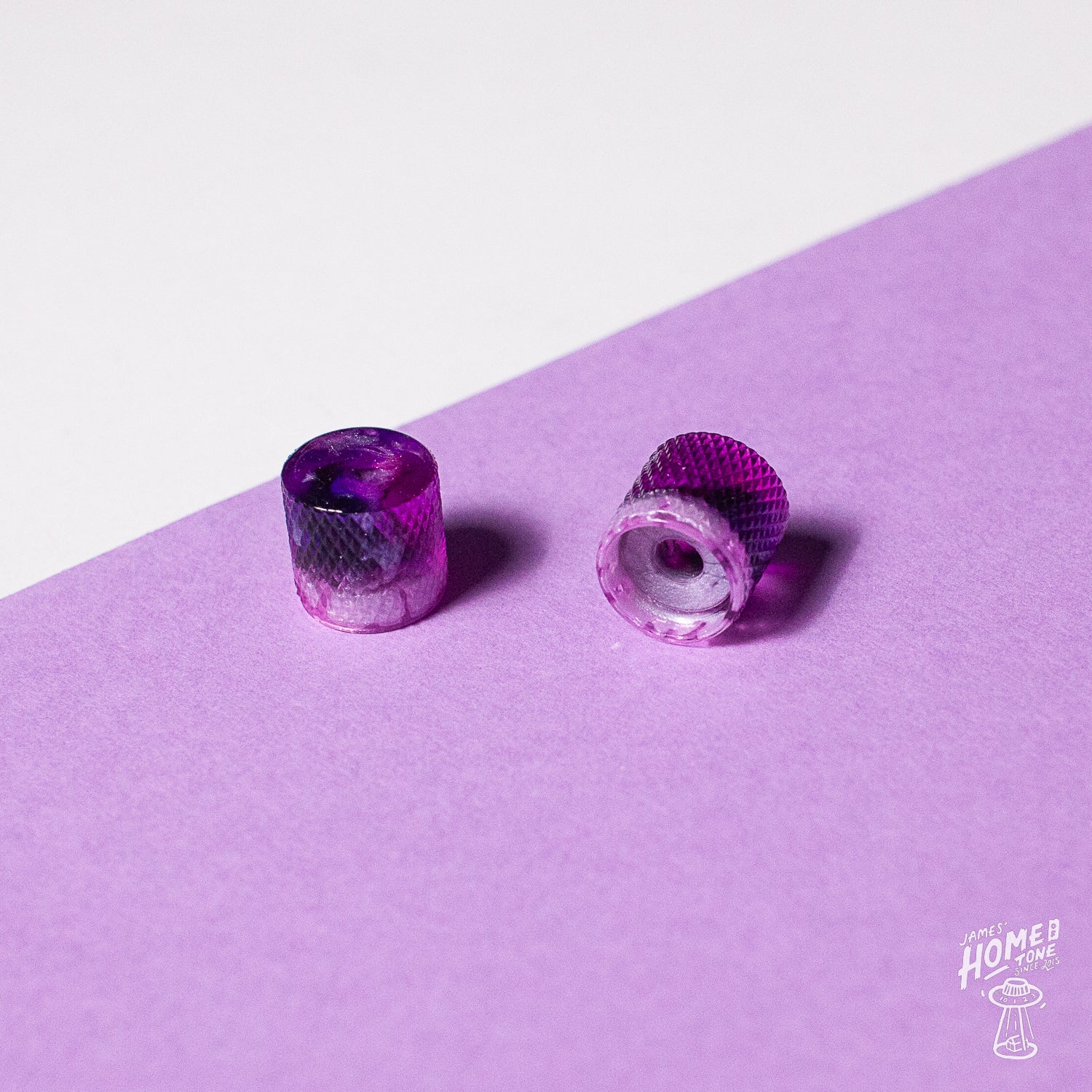 Of course a unique spin on the classic Tele style knurled barrel knob. A subtle dome to this, perhaps not quite a full dome but not flat topped. An awesome purple/sparkle white swirl colourway on these, really nice and vibrant pattern and colouring.