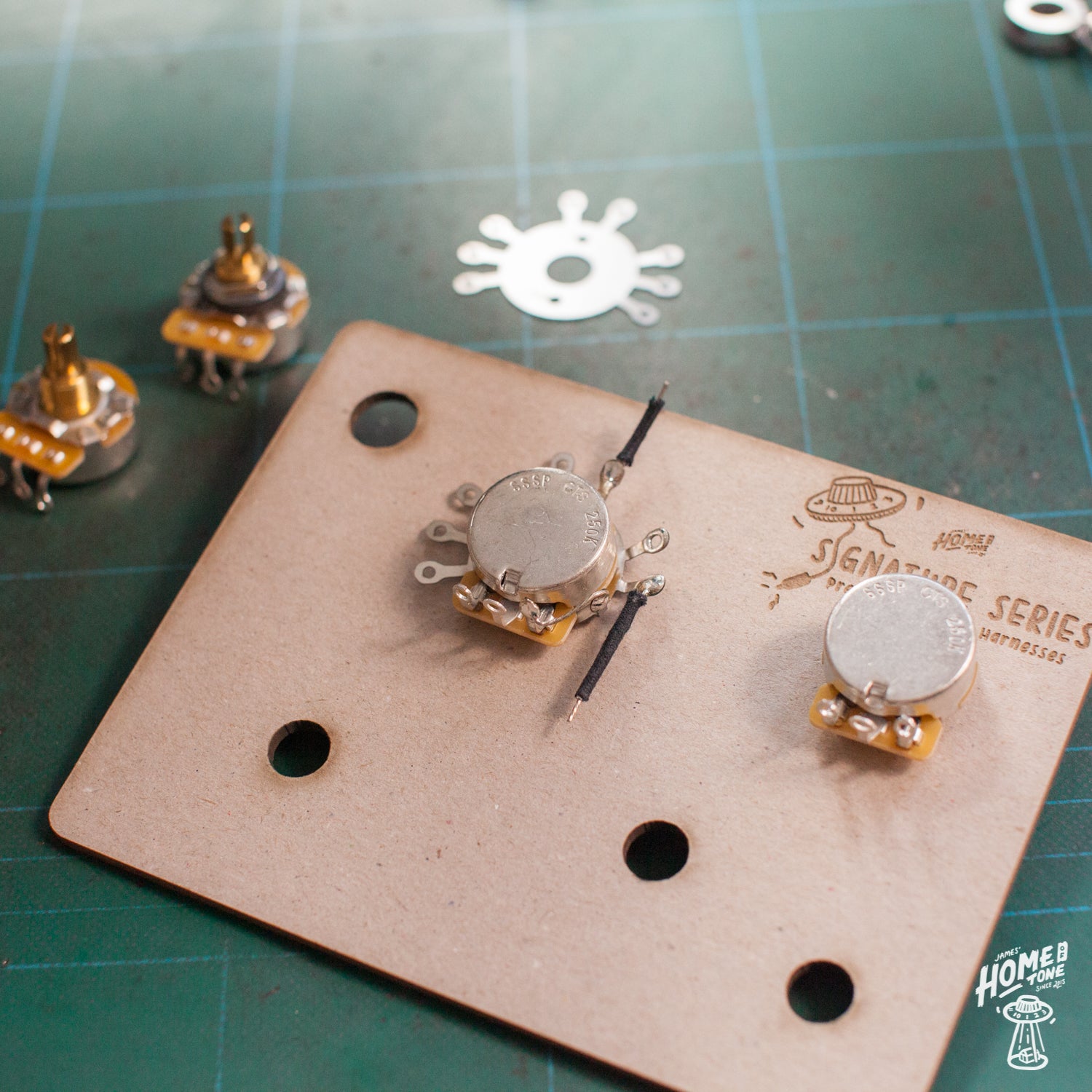 This is a simple washer design that fits underneath your pots and has extended lugs so that you can easily solder ground wires to. This is very useful for those that perhaps really struggle with making, or consistently making ground wire solder connections to pot casings, drastically reducing the risk of damaging a pot from excessive heat for example. As with the Ground Bug installed, you simply solder your ground wires to any of the 8 lugs available.