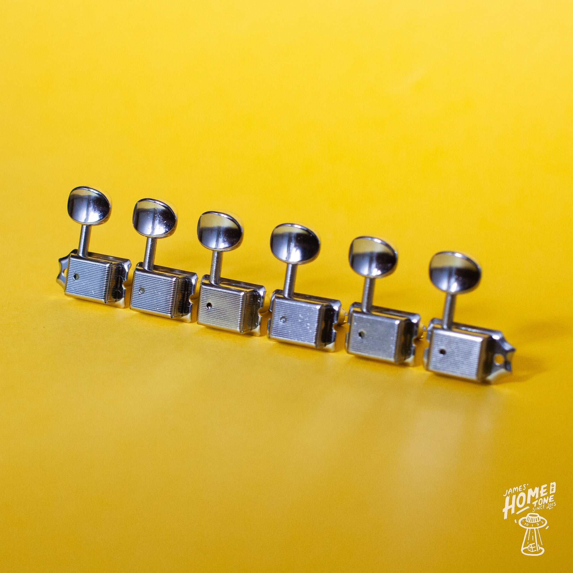 This is for a set of Gotoh vintage style 'button' tuning machines in the 6 in-line configuration, great for Strat, Tele or Jazzmaster for example and feature the split tuner post style (Often referred to as the 'Kluson Style' tuners). They come complete with push-fit bushings and mounting screws, and the buttons are the small vintage style metal oval buttons. Please note that these do not have any name stamped on the back casing, only the straight line etching as per images.